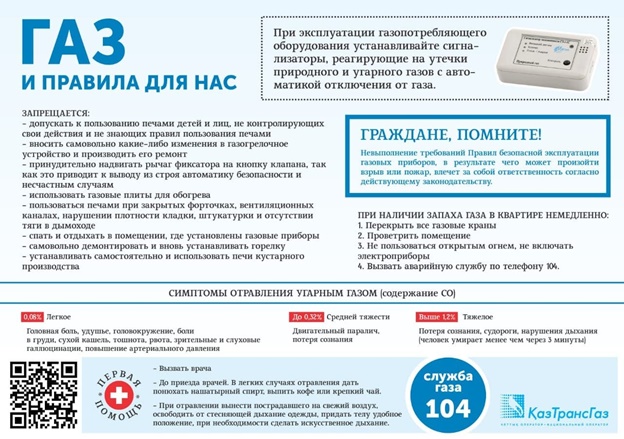 «КазТрансГаз Аймак» обращает особое внимание на необходимость обязательного соблюдения норм и требований действующих нормативно-правовых актов и нормативно-технических документов Республики Казахстан, предъявляемых к объёму помещений, где устанавливается газопотребляющее оборудование, а также к устройству вентиляционных и дымоходных каналов.