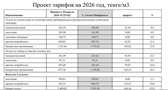 Предварительно в заявке указано, что среднеотпускной тариф на подачу воды вырастет на 9,9 % (без НДС), а на водоотведение — сразу на 24,2 % (без НДС). При этом рост не коснется населения. В департаменте комитета по регулированию естественных монополий (ДКРЕМ) Костанайской области отметили, что мораторий на рост тарифов для юрлиц и бюджетных организаций закончился, а для населения на территории области продолжает действовать. В результате для юрлиц и бюджетных организаций тариф на воду и канализацию вырастет в среднем на 17,3 % (без НДС).