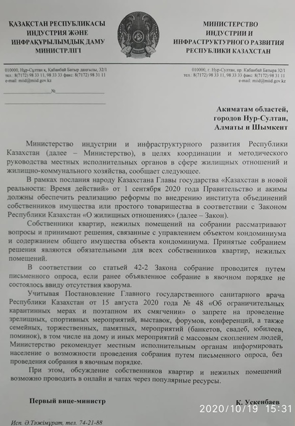 Из разных регионов страны присылают вот такой документ. На фирменном бланке Министерства индустрии и инфраструктурного развития РК информация о необходимости отказа от проведения собраний в очном порядке. Мы публикуем этот документ с целью получения от ведомственного органа МИИР официальную информацию насколько этот документ корректен, здесь нет ни подписи,ни печати, ни даты, ни номера регистрации в канцелярии министерства.