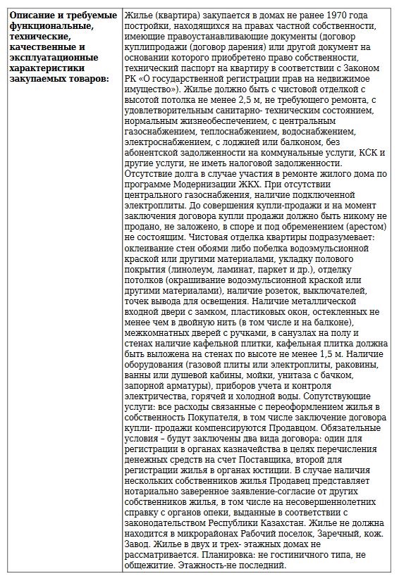 Надо сказать, 10 оставшихся лотов не нашли своих поставщиков, так что, если вы вдруг «буксуете» с продажей своей квартиры можете смело следить за новостями с сайта государственных закупок и реализовывать жильё акимату. Главное – соблюсти все требования заказчика. Они, впрочем, не самые жёсткие. Например, дом должен быть не позже 1970 года постройки, пластиковые окна, кафель в ванной, газовая или электрическая плита и другое. Хотим заранее огорчить жителей Рабочего посёлка, Заречного и Кожзавода – в ваших районах акимат закупать квартиры не намерен. Это указано отдельной строкой в технической спецификации.