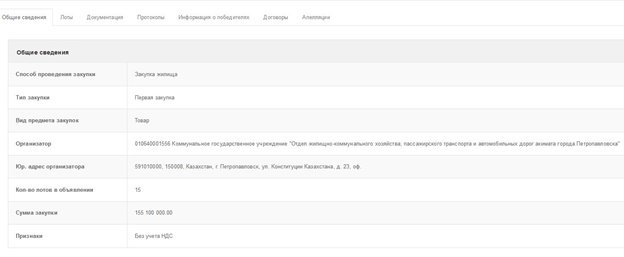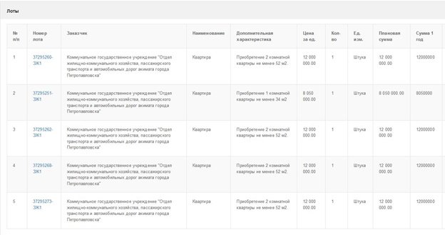 Ещё одно объявление, на этот раз под номером 5055026-1 в данный момент активно. В этом случае всё тот же отдел ЖКХ закупает 4 двухкомнатных и одну однокомнатную квартиру на сумму 56 050 000 тенге. Эти «двушки» по 12 миллионов должны быть уже не менее 52 м², что соответствует размерам «ленинградок», за меньшую по комнатности квартиру в 34 кв. метра акимат готов заплатить озвученные выше 8 050 000 тенге.
