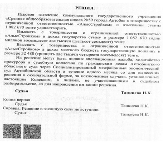 Например, ТОО «АлысСтройком» выполняло работы по капремонту школы №59, сумма договора 61 миллион 61 тысяча тенге. Суд обязал компанию вернуть заказчику из этой суммы 1 миллион 82 тысячи тенге.