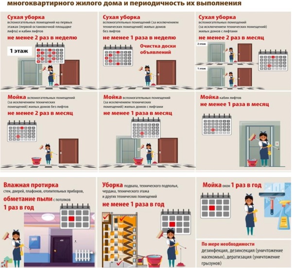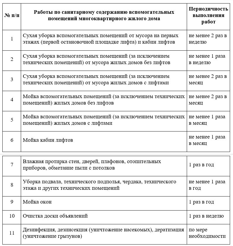 Перечень работ по санитарному содержанию вспомогательных помещений многоквартирного жилого дома и периодичность их выполнения установлены постановлением Министерства жилищно-коммунального хозяйства Республики Беларусь от 12.06.2020 № 7.