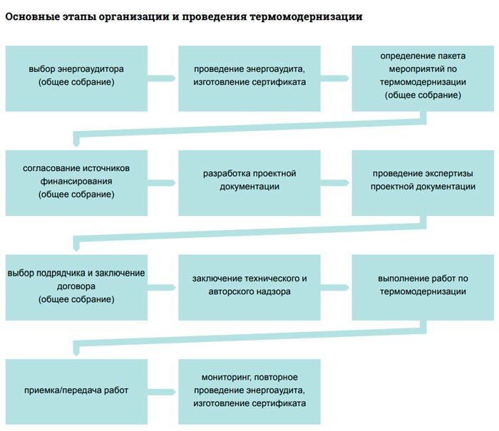 Первый шаг — представить и обсудить с собственниками общий план термомодернизации со всеми этапами проекта. Основные этапы организации и проведения термомодернизации