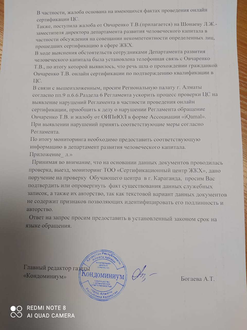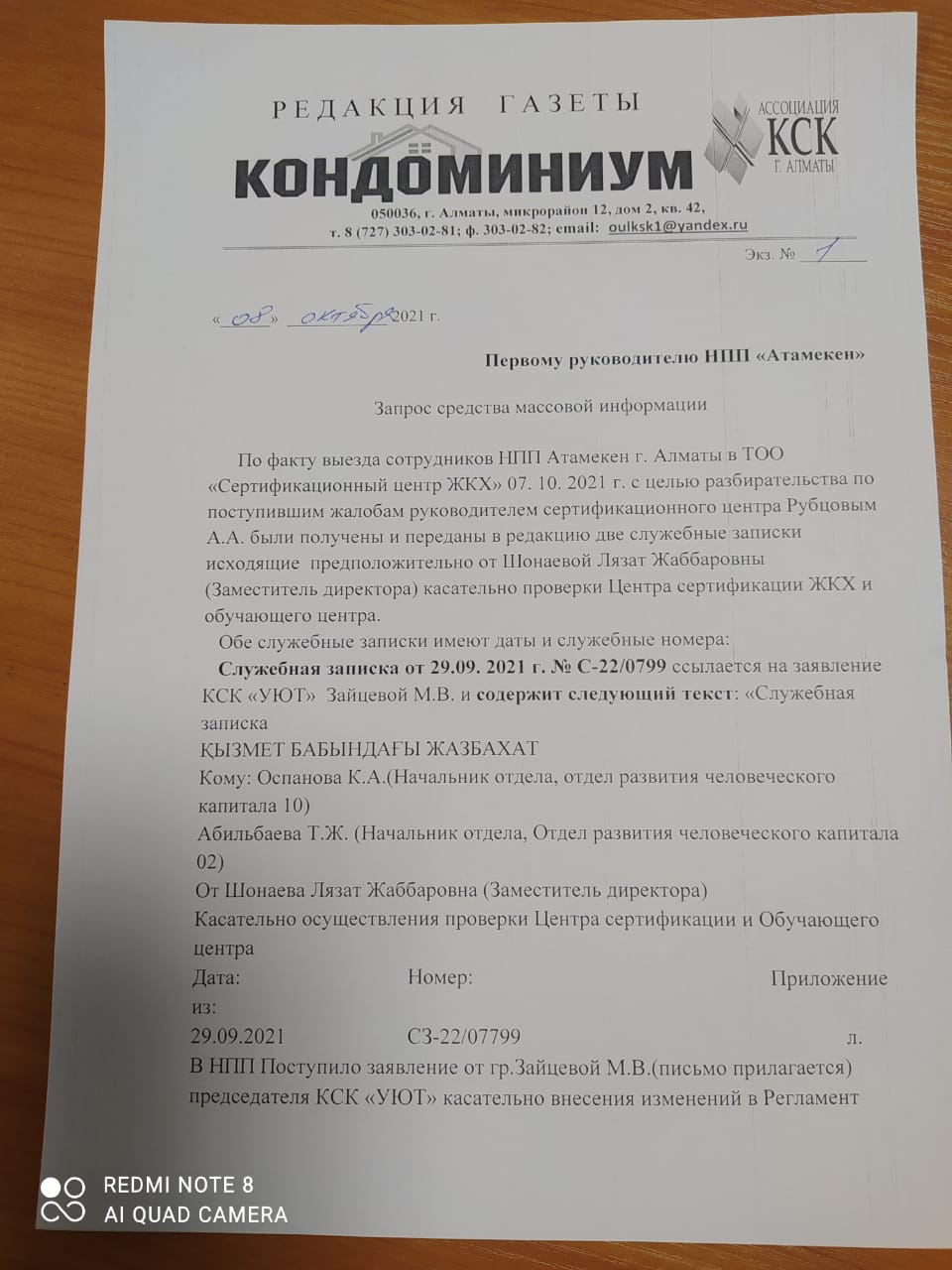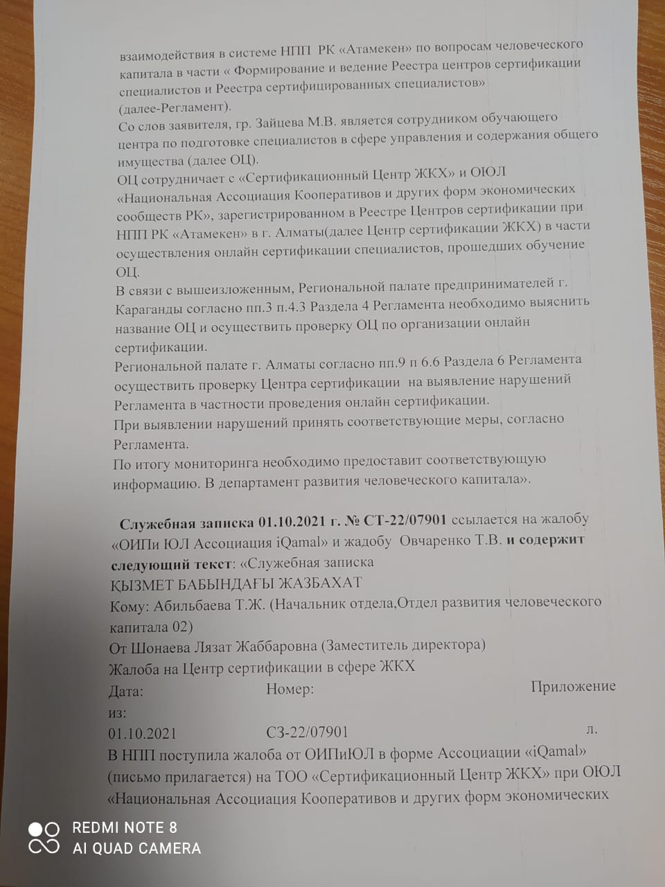 По факту выезда сотрудников НПП Атамекен г. Алматы в ТОО «Сертификационный центр ЖКХ» 07. 10. 2021 г. с целью разбирательства по поступившим жалобам руководителем сертификационного центра Рубцовым А.А. были получены и переданы в редакцию две служебные записки исходящие предположительно от Шонаевой Лязат Жаббаровны (Заместитель директора) касательно проверки Центра сертификации ЖКХ и обучающего центра.