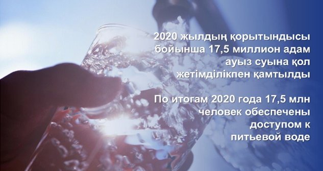 В 2020 году на реализацию 304 проектов было направлено 113,0 млрд тенге. Построено и реконструировано 4 425 км сетей водоснабжения и канализации. По итогу года доступ к питьевой воде составил 87,7% в сельской местности и 97,5% в городах. Общая цифра по стране составила 93,1% (17,5 млн. человек).