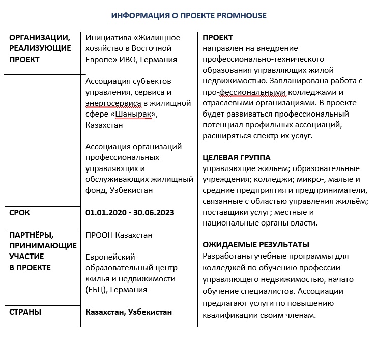 иативой «Жилищного хозяйства в Восточной Европе» (ИВО), г. Берлин, Германия и Ассоциацией субъектов управления, сервиса и энергосервиса в жилищной сфере «Шанырак», г. Нур-Султан, Казахстан в рамках проекта ЕС — PROMHOUSE.
