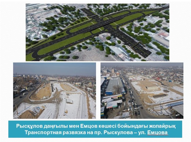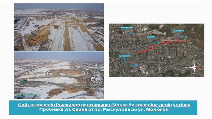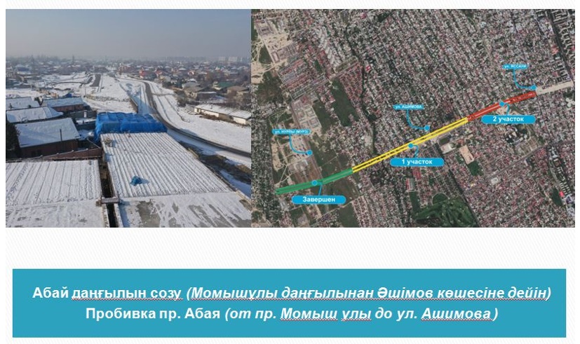 Кроме того, продолжается пробивка магистральных улиц, соединяющих центральную часть с границами города. Работа по пробивке пр. Абая до границы города ведется на двух участках – от пр. Момыш улы до ул. Ашимова и от ул. Ашимова до границы города.