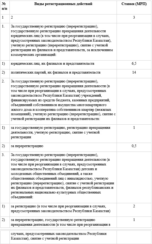 Ставки сборов исчисляются исходя из размера месячного расчетного показателя, установленного на соответствующий финансовый год законом о республиканском бюджете (далее — МРП), и составляют: