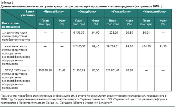 По данным Госэнергоэффективности, достигнуто соглашение, что в 2020 году «Укргазбанк» будет предоставлять «теплые кредиты» физическим лицам — на энергоэффективные мероприятия в частных домах, а также на приобретение твердотопливных котлов; ОСМД — на утепление многоэтажек. В свою очередь, «Укрэксимбанк» взял на себя обязательства обеспечивать выдачу «теплых кредитов» семьям, которые планируют внедрить энергосберегающие мероприятия в частных домах. Сводная информация по возмещению части суммы кредитов различного назначения, выданных населению или ОСМД / ЖСК при реализации программы «Теплые кредиты», приведена в таблице 3. Также с 2014 года рассматривалось создание государственного Фонда энергоэффективности, деятельность которого регулируется Законом Украины «О Фонде энергоэффективности»24 (№2095-VIII от 08 июня 2016 г.).