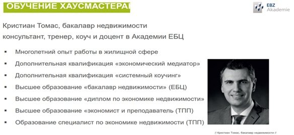 образовательного центра экономики жилищного хозяйства и недвижимости (ЕБЦ) из г. Бохум, Германия — Кристиан Томас, подробно рассказал об ответственности хаусмастера при обеспечении безопасности, о том, что не прописано в законе однозначно и что необходимо учесть в дальнейшем.
