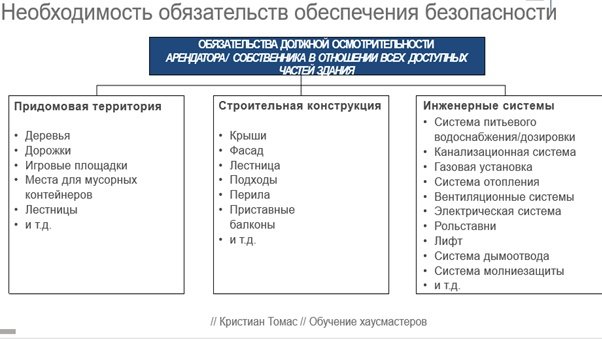 Ответственность хаусмастера очень важна. Необходимо предупредить об угрозах для людей при различных обстоятельствах как в придомовой территории, так и дома.