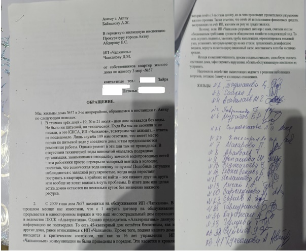 «Финансовый отчет организация ИП Чапканов никогда не предоставляла. Также на крыше нашего дома установлено множество антенн сотовой связи, деньги от аренды также поступали на счет ИП. Поэтому, если ИП Чапканов разрывает с нами договор, то считаем вполне обоснованным требование привести общедомовое хозяйство в надлежащий вид. Осушить подвал, заменить трубы канализации, отремонтировать тепловой узел, установить запорную арматуру на все стояки, организовать дезинсекцию подвала, вернуть на место циркуляционный насос, восстановить хотя бы частично кровлю. И по закону необходим акт сдачи приема дома жильцам или новой обслуживающей организации», — написали жильцы 57 дома в обращении к акиму города, жилищной инспекции и самой обслуживающей организации.